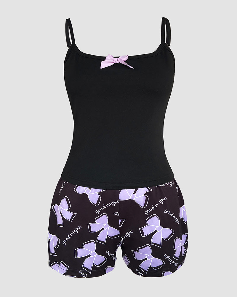 2 Pieces Outfit Spaghetti Strap Bowknot Decor Tank Top and Casual Floral Print Skinny Shorts Set