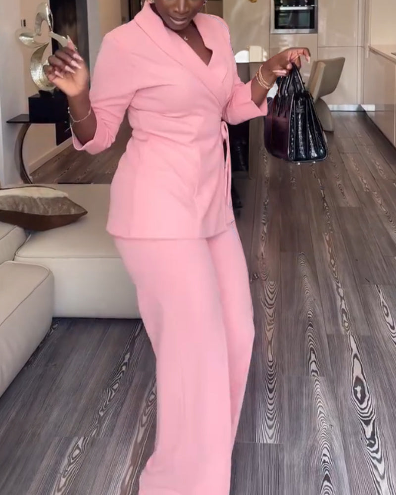 2 Pieces Outfit Overlap Shawl Collar Lace-up Side Cinched Waist Coat and Elastic Back Waist Wide Leg Pants Set Casual Blazer Set