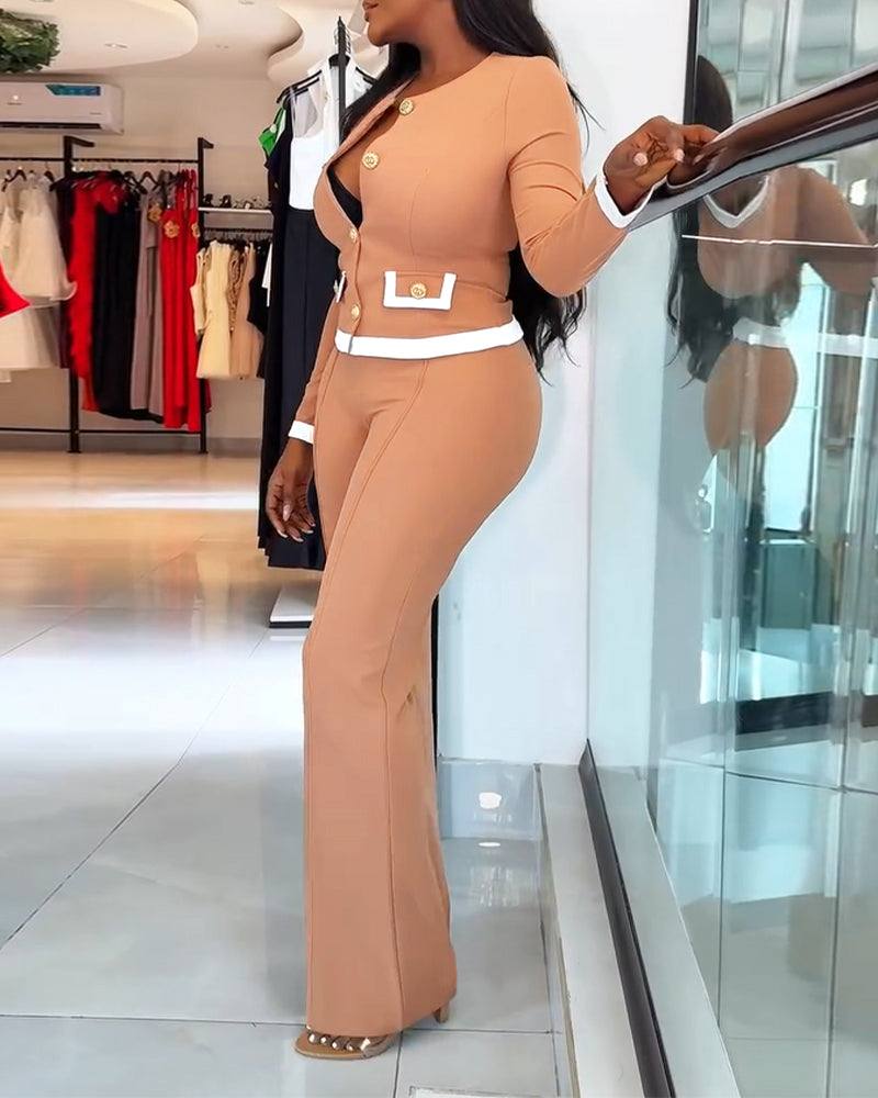 2 Pieces Outfit Contrast Paneled Single Breasted Flap Detail Crop Top and Elastic Waist Seam Front High Waist Pants Set Casual Commuting Set
