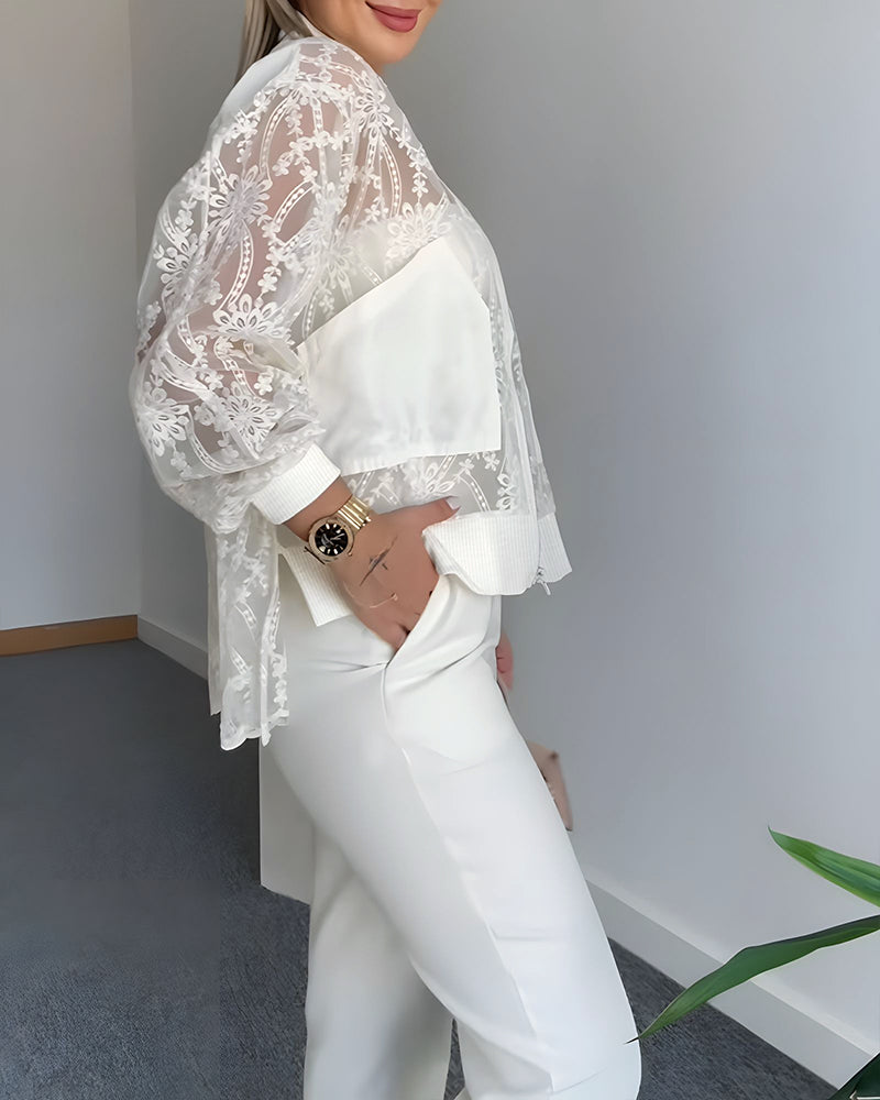 Floral Lace Embroidered Mesh Patchwork High-Low Hem Baseball Coat Casual Side Slit Zip Up Bomber Jacket