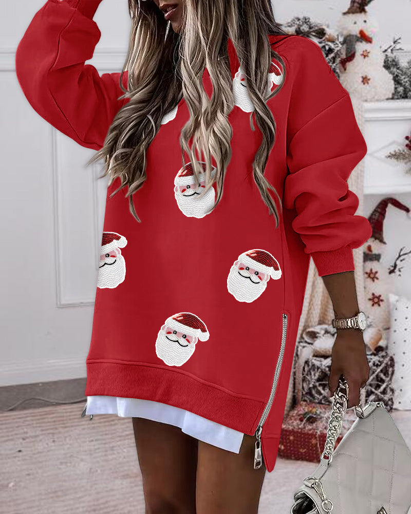 Christmas Santa Claus Pattern Sequin Patch Oversized Sweatshirt Zipper Side Slit Pullover Top
