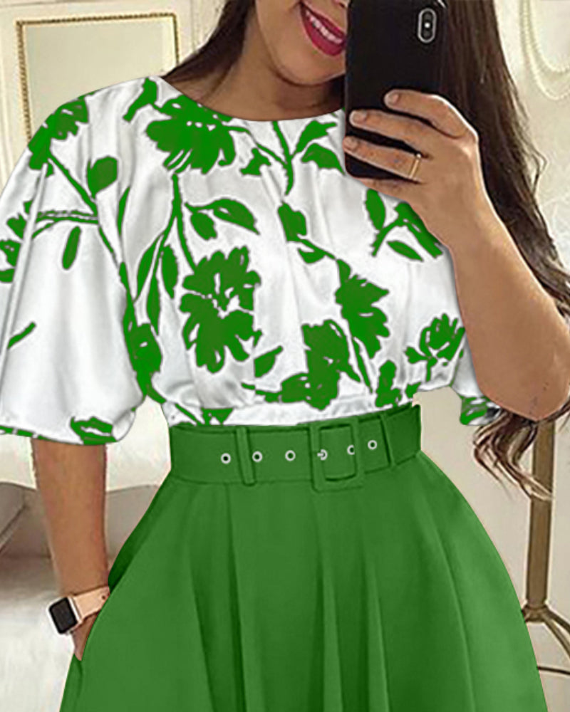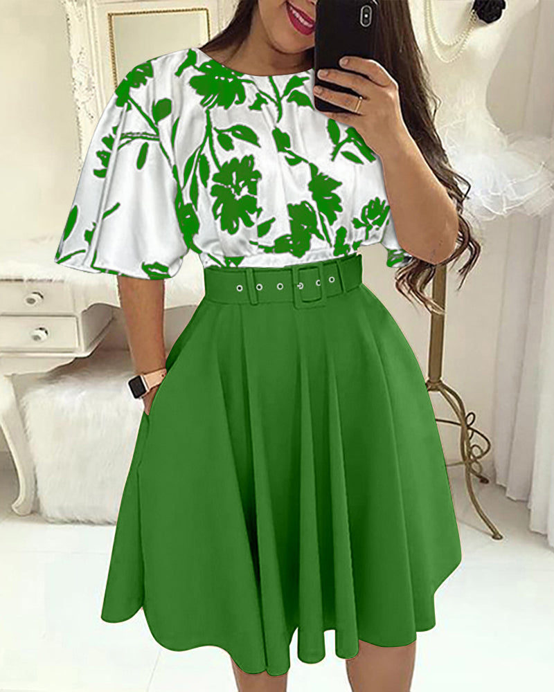 Floral Print Colorblock Flare Sleeve Shirred Back A-line Dress Casual Hollow-out Back Work Dress