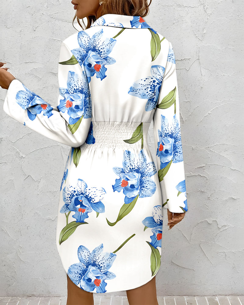 Floral Print Turn-down Collar Turn-Up Sleeves Shirred Back Shirt Dress Casual Button Down Cinched Waist Asymmetrical Hem Vacation Dress