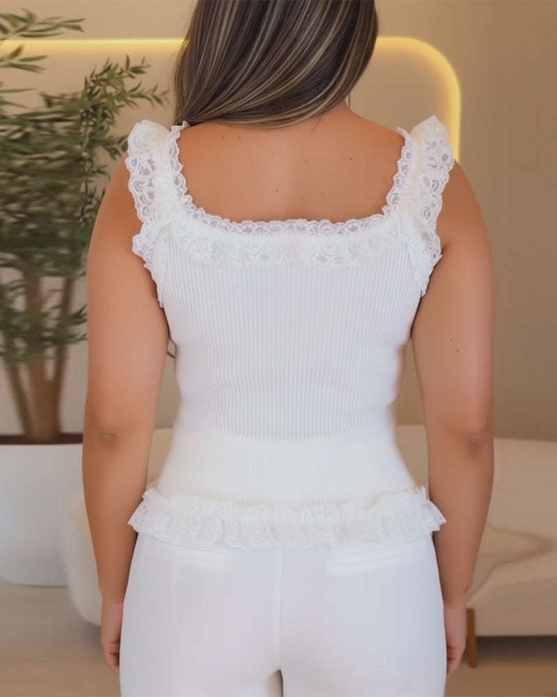Contrast Lace Sleeveless Square Neck Crop Tank Casual Frill Hem Metal Button Decor Ribbed Knit Top