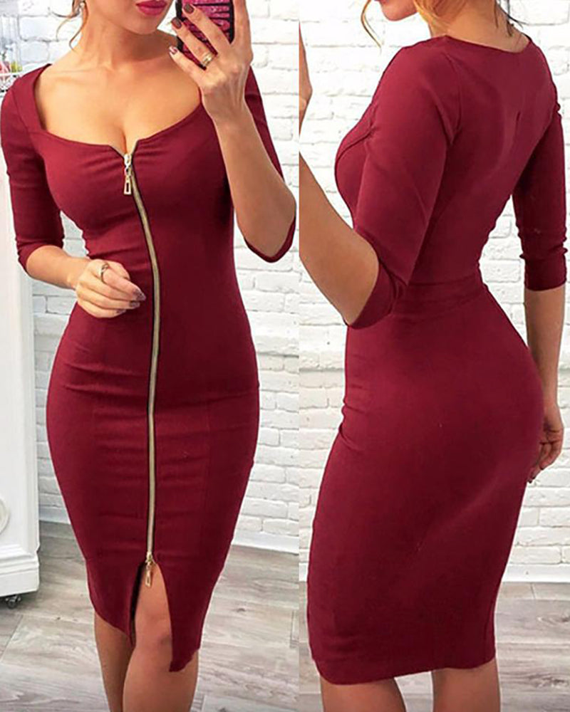 Square Neck Half Sleeves Bodycon Dress Full Front Zip Split Midi Dress