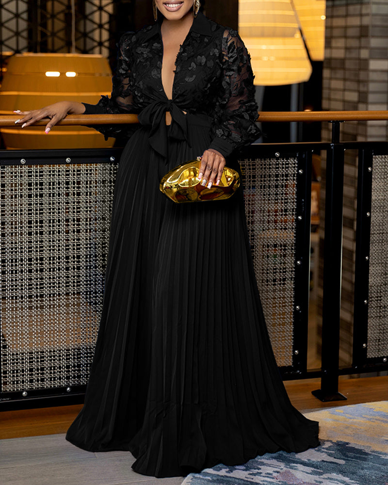 Jacquard Sheer Mesh Patch Turn-down Collar Jumpsuit Elegant Waist Tied Detail Pleated Flare Romper(blue,L)
